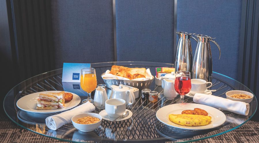 It includes complimentary daily breakfast in‑suite, afternoon tea delivered to their suite once per week, a welcome gift of Champagne and truffles, full‑size Elemis toiletries and GHD hairdryers, daily replenished water carafes and additional Lavazza coffee pods.
