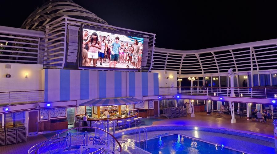 Crew members belt out songs from The Proclaimers or S Club 7 around the pool deck and passengers join in with karaoke and quizzes.
