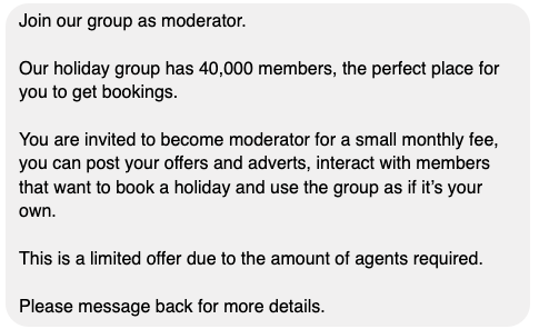 Becoming a moderator allows agents to post as frequently as they like in the groups and gain leads from other members, many of whom are keen holidaymakers.