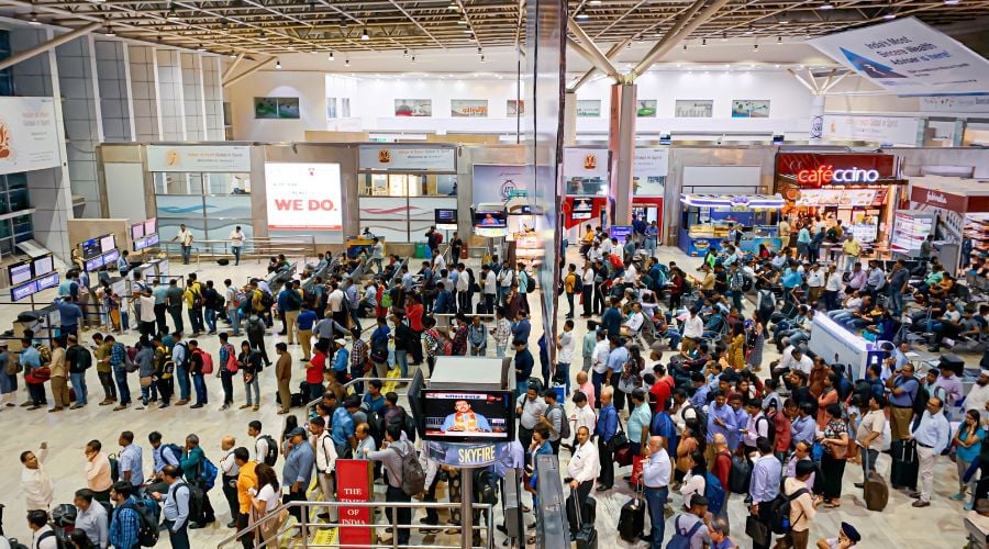 Image is a stock photo of Mumbai airport departure hall, taken in 2019