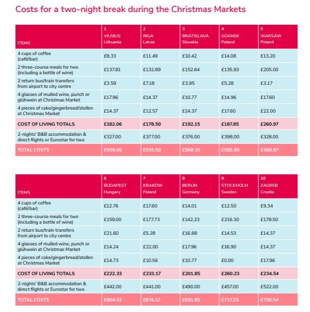 The barometer cost is calculated by combining the costs of return flights, two nights’ three- or four-star accommodation, airport transfers, two evening meals with wine, coffee, festive drinks and Christmas market snacks.