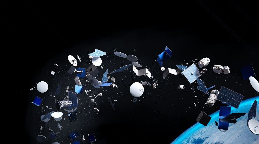 Imaage is a stock photo showing space debris including defunct satellites and spent rocket stages.