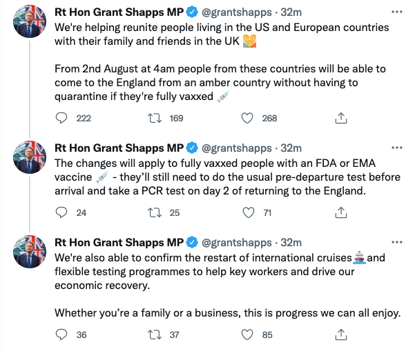 Mr Shapps announced on Twitter that from 4am on 2 August people vaccinated in Europe and the US coming to England from an amber country won’t need to quarantine. He also announced the ban on international cruises is being lifted.