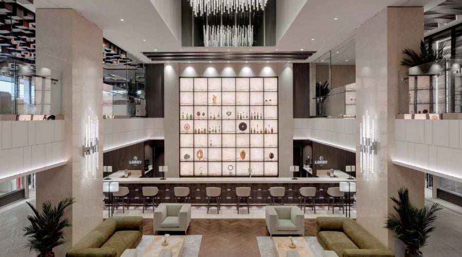 Walking along the plush cream carpet, passed high-end boutiques and into an elegant lobby lounge, with a stunning bar at one end and a marble and glass staircase topped by a Steinway grand piano at the other, you could be in a boutique European hotel. However, wander outside onto one of the effortlessly stylish deck areas with infinity pools, white-curtained cabanas and chaise longues, and you feel like you’re on a private yacht.