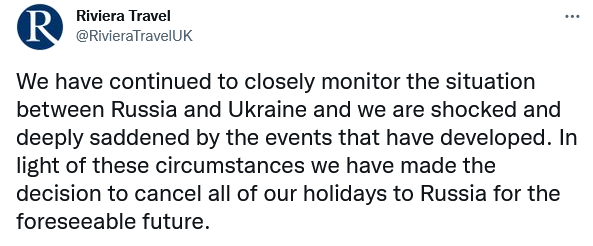 “In light of these circumstances, we have made the decision to cancel all of our holidays to Russia for the foreseeable future.”